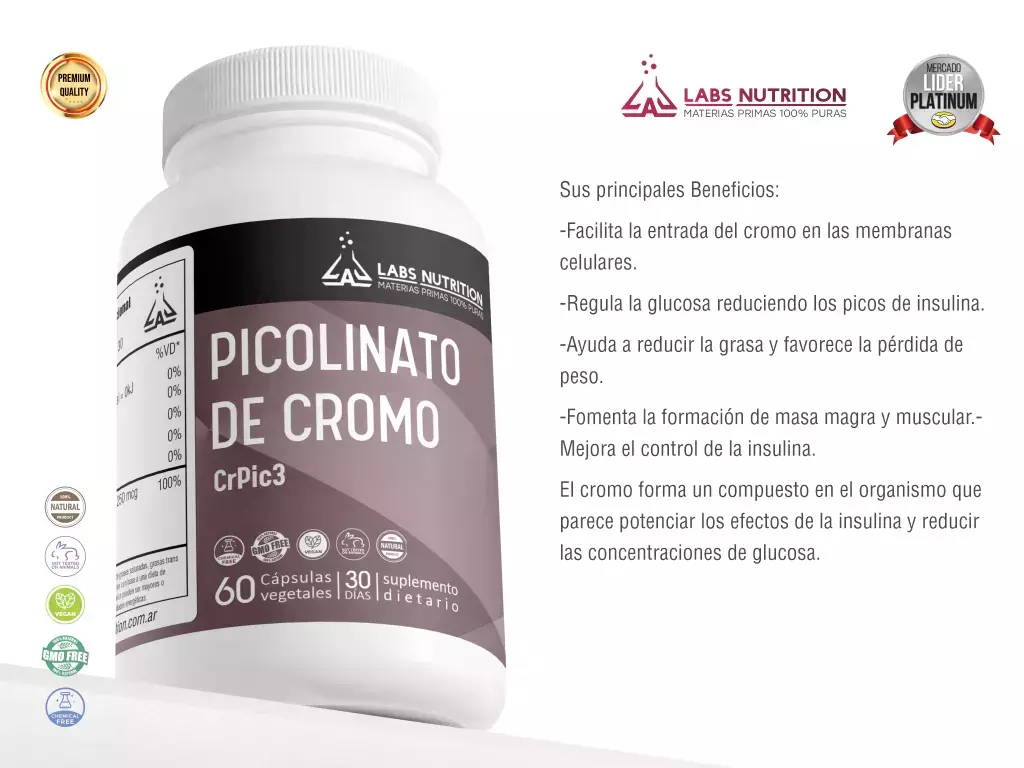 PICOLINATO DE CROMO es un compuesto que se elabora a partir del ácido picolínico y cromo, el ácido picolínico funciona como transportador para facilitar el acceso a las membranas celulares del cromo.