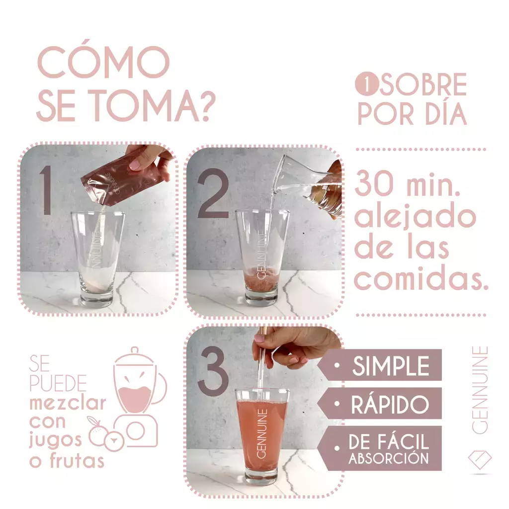Fórmula: Colágeno hidrolizado 10 gramos diarios + 4 activos: Ácido Hialurónico 20 mg diarios, Té Verde 350 mg, Vitamina E 10 mg diarios, Luteína 10 mg diarios y Vitamina C 45 mg diarios.