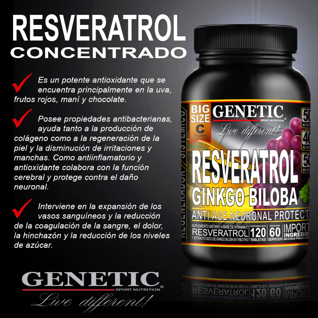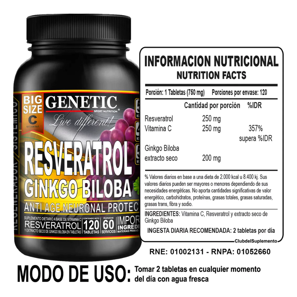 Protección celular y vitalidad reforzada con este suplemento avanzado de Genetic, formulado con ingredientes clave para apoyar la salud cardiovascular, cognitiva y el bienestar general. Diseñado para un suministro de 2 meses, combina resveratrol, ginkgo biloba y vitamina C en una fórmula práctica y sin sabor.